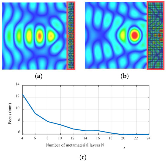 Simulated E-field distribution for the lens (red rectangular) with = 8 (a) and the lens with = 22 (b). Focal distance vs. the number of layers (c).