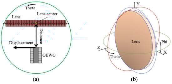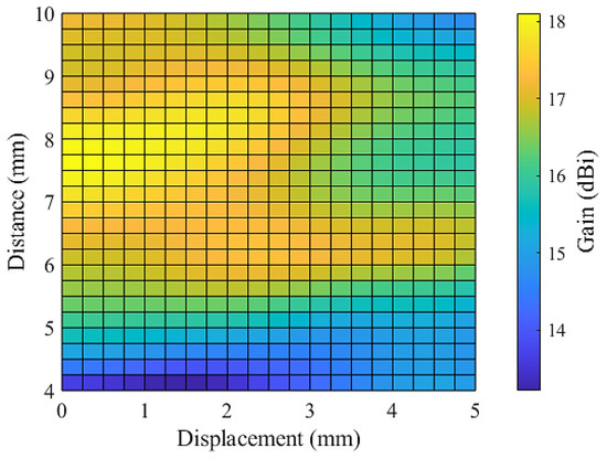 The beam steering capability in such lens antenna systems is obtained by shifting the OEWG. This displacement leads to additional gain reduction due to inefficient illumination of the lens surface. To estimate the gain, simulations for the lens with the number of unit cell layers = 10 with different displacements of the OEWG were carried out. Figure 9 shows gain as a function of the OEWG shift along the optical axis of the lens (distance to the feed) and laterally (displacement of the feed). One can see that in order to effectively illuminate the surface of the compressed lens, it is necessary to increase the distance to the feed when the feed is laterally displaced.