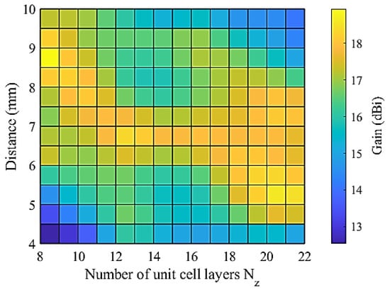 The dependence of the gain on the number of unit cells and the distance to the feed are shown in Figure 8. In our simulations, we used the realized gain as the metric that incorporates the effect of impedance matching as well. It can be seen that for the different numbers of unit cells in the lens structure, the optimal position of the feed changes. An increasing number of unit cell lenses leads to the position of the feed being closer to its surface. For instance, with an 8-layer lens, the distance to the feed is 9 mm; the same gain can be obtained with a 22-layer lens and a 5 mm distance to the feed. The simulations support our previous finding that the focal point moves away from the lens surface for lenses with higher compression.