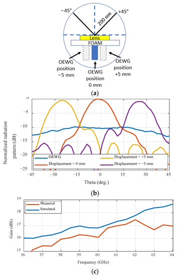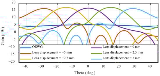 In our case, a focus of 5.96 mm (where 0.96 mm is half the lens thickness and 5 mm is the distance between the lens surface and the OEWG) was chosen. Taking into account that in the case of a spherical lens, the focus is equal to its radius, an approximately 63.6% size reduction was achieved in our lens antenna system. Radiation pattern results for this focal distance and different OEWG displacements are presented in Figure 10. In comparison with the OEWG without the lens, the antenna gain was enhanced by 11 dB to 16.8 dBi. In this particular case, the sidelobe level was 15 dB for a 0 mm OEWG displacement and around 10 dB for an OEWG laterally shifted by 5 mm. In addition, shifting the waveguide with a 2.5 mm step allowed overlapping radiation patterns at −2 dB level. Beamwidth and gain as a function of frequency are shown in Figure 11. Since a lens is a wideband device, its gain increases with frequency, and a compressed lens exhibits the same tendency. The impedance matching mostly corresponded to one of the exciting waveguides and the return loss wasa better than 10 dB across the simulated frequency band (56–64 GHz).