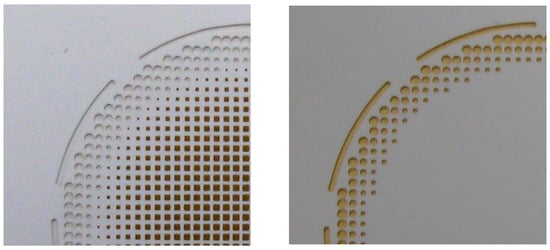 Details of a layer pair, in this example, for 1A (left) and 1B (right). The cut holes for each layer pair are the same. After stacking, the screen-printed patches are found between the two dielectric layers.