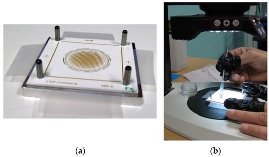 After preparing the layers, stacking was made with the help of an alignment fixture, (see Figure 14). For each stacked layer, HEC 2wt% (Hydroxyethyl-cellulose) was filled in the holes manually by using a spatula. This HEC material serves to protect the holes from collapsing during lamination. The method has been published in [21]. After stacking, uniaxial lamination was performed at 70 °C with an applied pressure of 17 MPa for 5 min. Then, the lens was separated from the rest of the LTCC by laser. The last fabrication step was the firing at 850 °C peak temperature for 30 min. The finalized antenna is presented in Figure 15. Some damage can be seen at the outer periphery of the lens. This may have some impact on the measured results.