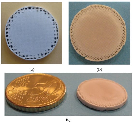 Finalized lens antenna (a) before firing, and (b) after firing. (c) The lens sample in comparison with a 50-euro-cent coin.
