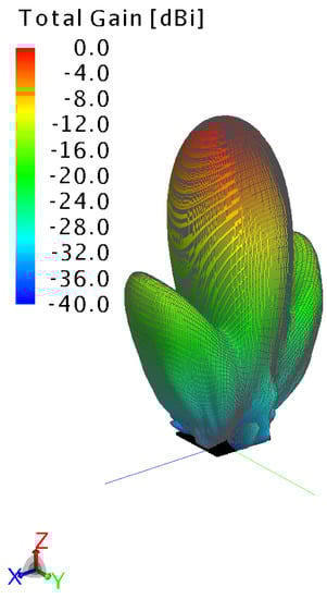 The measured 3D radiation pattern is computed from a classic near-field to far-field transformation available in Altaïr FEKO Software and is shown in Figure 18. To analyze the scanning performance, the probe is moved along the 200 mm circle with a center at the top of the lens opposite the OEWG center. The radiation pattern was measured in the range between −45° and 45° for the Luneburg lens as well as the OEWG at 60 GHz, as shown in Figure 19. It can be seen that the lens provides a 10 dB gain enhancement in comparison to the OEWG. The side lobe level for this sample is defined as 10 dB. By moving the OEWG along the lens, beam-steering capability is achieved. We can see from the measurements that a 5 mm shift of the feed leads to beam steering at 25 degrees with 1 dB scan loss. The total gain was measured and compared to the simulation in Figure 19c. The broadside gain of the manufactured lens antenna was equal to 16 dBi at 60 GHz. Radiation efficiency of 89% and aperture efficiency of 28% were calculated at 60 GHz. The latter figure is explained by the non-optimal illumination of the lens area, which is reasonable as the source is moved across the surface of the lens to achieve beam steering.