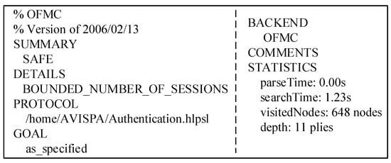 We adopt the AVISPA tool to verify the security of the authentication phase, and its analysis result is presented in Figure 3. We enable OFMC (on-the-fly model checker) in AVISPA to verify the identity authentication between the GWN and the hardware token as the goal in order to verify the security of the G2F framework design. The statistics presented in Figure 3 show that the state search time during the entire verification process is 1.23 s, with 648 visited nodes and a depth of 11 plies, and the summary is safe.