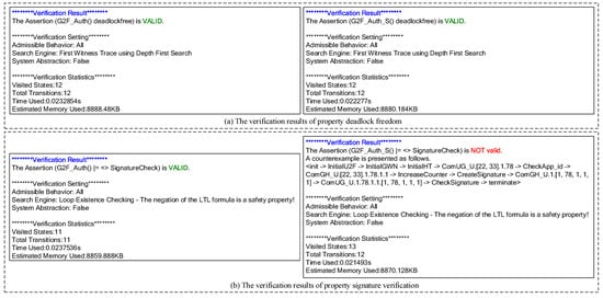 Table 5. The verification results of properties for Timed CSP models. - Signature verification property (in Table 4(2–4)): In the coarse-grained verification, by default, all signatures can be successfully verified by the U2F server, so the signature verification property is not considered. Here, we verify the signature verification property in the CSP model (G2F_Auth() and G2F_Auth_S()). The property of signature verification is described in the LTL formula, which illustrates a linear-time property. PAT supports the LTL formula by using #assert P() |= F to check whether system P() satisfies the LTL formula F. Using the “eventually” operator () in LTL, we describe a situation in which the U2F server checks the signature successfully. As the G2F_Auth_S() introduces signature-faking attacks, the signature verification property can effectively detect these attacks. As shown in Figure 4b, the valid verification result of G2F_Auth() indicates that the G2F framework can successfully verify the signature under normal operation, and the invalid verification result of G2F_Auth_S() means that our methodology is able to detect illegal signatures to protect the user’s legal authentication. Therefore, we can conclude that G2F can effectively identify the signature of a hardware token forged by an intruder.