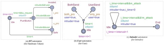 For persistent multiple attacks, we focus on a situation in which the hardware token receives a notification both from the user and the intruder simultaneously when its button is pushed. Therefore, the behavior of the G2F framework under persistent multiple attacks can be simplified to three automata (The full implementation in UPPAAL-SMC can be found at https://github.com/asunafy/MFF/tree/main/UPPAAL (accessed on 28 March 2023)) (HT automaton, User automaton, and Intruder automaton), as shown in Figure 5. HT automaton denotes a situation in which the hardware token receives notifications from the user or intruder, then completes the push-button action. User automaton indicates a situation in which the user sends a notification to the hardware token. Intruder automaton represents a situation in which the intruder sends notifications to the hardware token periodically. Here, we explain some of the functions implemented in HT automaton shown in Figure 5 as an example. Edges among Idle, PushButton, Invaded, and Safe with the branch illustrate the user and intruder requests are both received when the user pushes the button. The second Boolean condition (intruder&&User) means that the hardware token has received the requests from both the user and the intruder. Meanwhile, the Invaded branch state is with probability weight i_pro, and the Safe branch state is with probability weight u_pro.