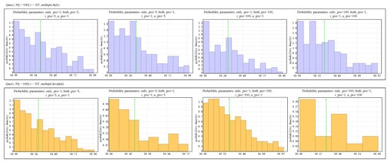Figure 6. Statistics in four different probability settings for persistent multiple attacks when the user pushes the button at the 50th time unit and the intruder attacks every 5 time units. - Probability properties of persistent multiple attacks: Using the four probability settings in Figure 6, the answers of the query in Table 6(3) are [0.499902, 0.599848], [0.757374,0.857253], [0.393781, 0.49372], and [0.822723, 0.922673], with 95% confidence intervals obtained from 398, 254, 397, and 182 runs, respectively. Meanwhile, the answers to the query in Table 6(4) are [0.421586, 0.521483], [0.151334, 0.251058], [0.473541, 0.573489] and [0.0619394, 0.16173], with 95% confidence intervals obtained from 401, 263, 401, and 163 runs, respectively. These results show that HT_multiple has a higher probability of reaching a Safe state than reaching an Invaded state within the given time limit, except when probability parameters both_pro and i_pro are too large. That is to say that persistent multiple attacks can be successful with a certain probability, but the probability is generally lower than that of an unsuccessful attack. Figure 6 shows the probability density distribution of the two time-bounded reachability properties, the abscissa means of which run for a duration in time. Therefore, we can conclude that in most cases, the probability of entering a safe state is higher than that of entering an unsafe state. In some cases, the probability of the two states is similar. Thus, the G2F framework defense mechanism is relatively weak against persistent multiple attacks, and caution is still needed.