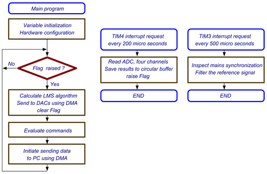 Timer TIM3 is used to issue an interrupt every 500 μs; on this interrupt, the reference signal is being processed. A square-wave signal coming from the main’s zero-crossing detector is reshaped to include only the first few harmonics of the main’s signal and thus allows the LMS compensation for those harmonics only. The reshaped signal is stored in a separate circular buffer and is available to the LMS algorithm as reference signal xi.