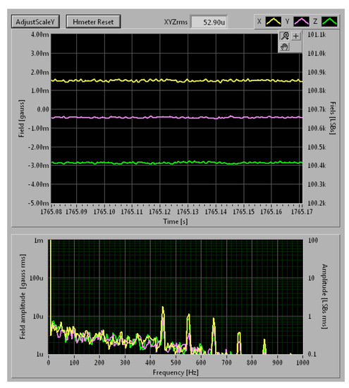 Finally, the adaptive LMS algorithm was activated to compensate for the interfering field in Figure 4. The resulting timing diagram and spectrum after about 20 s of adaptation are presented in Figure 5. The first four components in the spectrum were completely compensated for; there was no sign of interference at 50 Hz, 150 Hz, 250 Hz, and 350 Hz. The component at 450 Hz was reduced to about one-half, while the higher harmonics remained as they were. The resulting effective value of the interfering signal in a frequency range from 0 Hz to 1 kHz was about 53 μG, which is about 28 dB better than without the compensation. The compensation in the frequency range from 0 Hz to 400 Hz was significantly better since all the peaks in this range were at the noise floor.