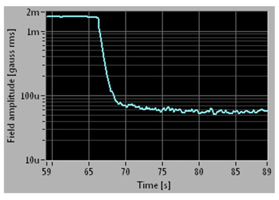 The adaptation procedure for the LMS algorithm requires some time, which strongly depends on the LMS gain factor μ. For the small factor μ, the adaptation process takes a longer time, and the compensation is more precise, while for the larger factor μ, the adaptation is faster but more sensitive to random (not periodic in nature) interfering signals. Since the aim of this experiment was to compensate for interference from the mains, the smaller factor μ is superior. Figure 6 shows the behavior of the rms value of the interfering magnetic field during adaptation; it dropped from about 1.4 mG rms for more than 20 dB in a few seconds and continued dropping to the forementioned −28 dB within 20 s.
