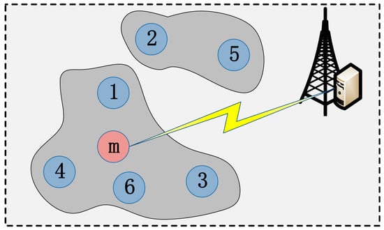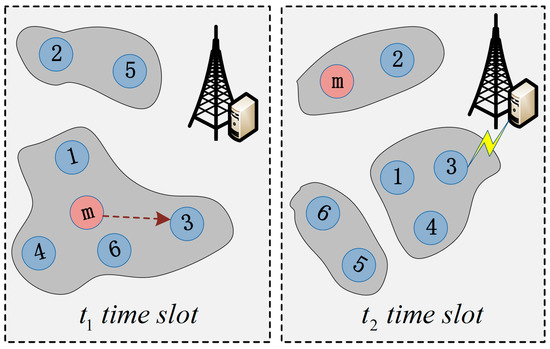 For this reason, we consider that nodes cooperate to complete the uploading of parameters, as shown in Figure 2. Some nodes need more energy for parameter uploading, while some nodes need less energy for parameter uploading because they may move close to the edge server in some time slot. In this paper, we consider mobile device cooperation through this type of opportunistic communication in HFL. When they meet each other, an online node cooperation algorithm can be used to reduce energy cost for uploading parameters under the latency constraint. For a node and a neighboring node that it meets with, a decision can be made on whether to transmit local model parameters to this neighboring node or not. Once the relay node is selected as a relay, it will be used for cooperative transmission.