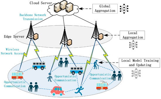 For this problem, Federated Learning (FL) was proposed in 2016 [5], a distributed machine learning approach for training. The traditional federated learning model is based on the Client-Cloud star topology [6]. After obtaining the initial global model from the cloud server, each participating device uses the local dataset for local model training and uploads the model parameters to the cloud server. The cloud server performs a global model update based on the local model parameters of each device. It effectively resolves the conflict between data privacy protection and data sharing requirements of privacy-sensitive devices. However, many communication loops are required between the cloud server and the participating devices to exchange model parameters. In particular, traditional federated learning is not applicable when training and managing data-intensive, latency-sensitive machine learning tasks on large-scale networks. However, edge computing has become a key technology to solve a series of problems caused by the increasing number of interconnected devices and large-scale data transmission [7,8]. Therefore, researchers have combined federated learning with edge computing in the last two years to address this problem and proposed Hierarchical Federation Learning (HFL) based on Client-Edge-Cloud architecture [9,10,11].