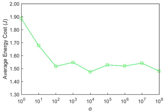 In OSRN, the values of energy cost weight coefficient and delay weight coefficient have an impact on the energy cost of uploading parameters. When the delay weight coefficient is 1, the impact of energy cost weight coefficient on average energy cost is shown in Figure 4. When the value of is small, the average energy cost is high, and when the value of is large, the average energy cost is low. This is because, in the comprehensive cost caused by the node for uploading parameters, the quantity level of energy cost value is far less than the quantity level of delay value. The greater the value of energy cost weight coefficient , the greater the proportion of energy cost in comprehensive cost. That is, it is more important to reduce the energy cost of nodes uploading parameters to edge servers. Therefore, the appropriate value of is .