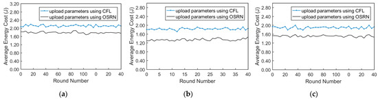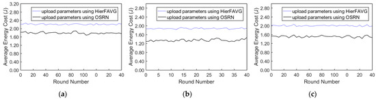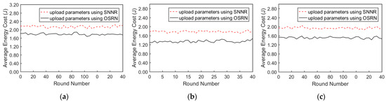 We compare the performance of OSRN with SNNR. In SNNR, all nodes randomly select a node from the neighboring nodes as a relay node and collaboratively upload parameters to the edge server with the help of this relay node. It is found in Figure 6a that the energy cost of OSRN is lower than that of SNNR, with an average reduction of 16.79%. It is shown in Figure 6b that the average energy cost of OSRN is lower than that of SNNR, and it is reduced by 24.34% on average. It is observed in Figure 6c that the energy cost of OSRN is lower than that of SNNR, with an average reduction of 22.04%. This is because randomly selected neighboring nodes in SNNR may be far away from the edge server. Moreover, the OSRN continuously detects all neighboring nodes within the maximum delay. In subsequent time slots, nodes encounter optimal relay nodes with low transmission energy cost. Moreover, it is also found in Figure 6a–c that OSRN can perform better when the edge servers’ locations are deployed in the center.