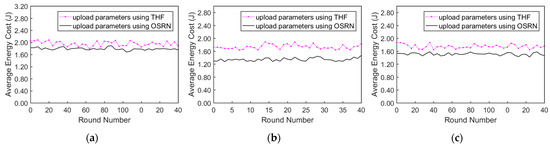 As shown in Figure 8a–c, the average energy cost of OSRN is lower than that of THF, with an average reduction of 8.74%, 22.54%, and 13.54%, respectively. The core idea of THF is also to optimize the process of uploading model parameters through clustering, and nodes upload parameters to edge servers through cluster heads. However, cluster heads are not randomly selected. In THF, all nodes in the network are divided into different clusters by agglomerative clustering. The head node of each cluster is selected based on the bandwidth of each node and distance to the edge server. The nodes in the same cluster upload their parameters to the edge server through the same head node. That is, in each cluster, there is only one relay node in the process of uploading parameters to the cloud server. However, in the OSRN, we continuously detect the shortest distance of all neighboring nodes of each node within the remaining delay to ensure that each node can select the optimal relay node with the minimum energy cost to complete parameter uploading. Moreover, the neighboring nodes of each node can be fully utilized. Therefore, the performance of OSRN is better than THF.