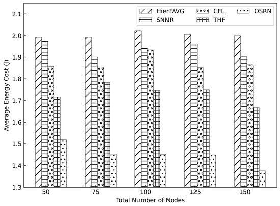 Figure 9 illustrates the average energy cost while directly uploading parameters using HierFAVG, randomly selecting relay nodes using SNNR, as well as using CFL and THF, when the total number of nodes varies. It can be observed that with the increase of the total number of nodes, the fluctuation of average energy cost with using HierFAVG, SNNR, CFL, and THF is not obvious and fluctuates up and down. It is also found that the average energy cost using OSRN is always no higher than the above four comparison algorithm, which demonstrates the better performance of OSRN. When the total number of nodes is in the range of , with more cooperative nodes, each node has more neighboring nodes to choose from in the relay node selection process and may choose a more appropriate relay to upload parameters cooperatively. Therefore, the average energy cost of OSRN decreases gradually within this range.