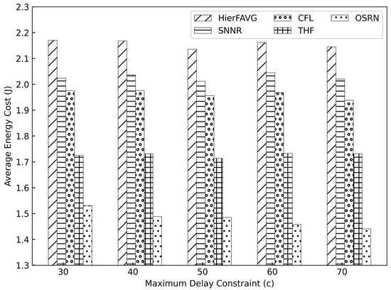 Figure 10 illustrates the impact of maximum delay constraint on average energy cost. It can be observed that with the increase of the maximum delay constraint, the average energy cost of using HierFAVG, SNNR, CFL, and THF fluctuates up and down, and the fluctuation is not obvious. When the maximum delay constraint is in the range of [30,70], the average energy cost using OSRN is always no higher than the above four comparison algorithms and decreases gradually within this range. This is because when the maximum delay constraint becomes larger, nodes have sufficient remaining time to select a better neighboring node as a relay for uploading parameters cooperatively. In addition, each mobile node may move closer to the edge server within the remaining delay constraints. Therefore, the energy cost of OSRN decreases with the increase of maximum delay constraint.