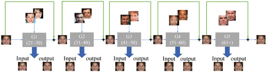 Considering the dataset’s wide range of ages, the interval is divided into six groups: up to 20, 21–30, 31–40, 41–50, 51–60, and above 61 years. Inspired by the methodology presented in previous work [12], which employed an RNN to effectively capture the transformation patterns across various age groups, we adopt five sub-generators to model the transition patterns between adjacent age groups. By applying a skip connection in the sub-network, the network allows easy control over the aging flow, as shown in Figure 1. Assuming the age group depends on the age group , six age groups can be formulated as shown in Equation (1):