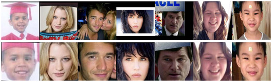 Data processing on the image was conducted as follows. (1) Data cleaning and normalization. To filter the images with borders, which can reduce the accuracy of face recognition, the input images were preprocessed and normalized. This involves cropping the borders and retaining only the facial portion. The multi-task cascaded convolutional network was utilized to detect the facial landmarks and areas and align the facial images based on the identified eye coordinates. Figure 3 shows some face images that have been aligned and normalized from the Age_FR dataset. (2) Data annotation. The dataset’s original gender and age annotations were collected and identity annotations were created manually. The Age_FR dataset contains annotations including identity, gender, and age information, which renders it well-suited for employment in tasks related to face aging. (3) Manual inspection. After annotation, the accuracy of all images and their related annotations were confirmed through manual inspection.