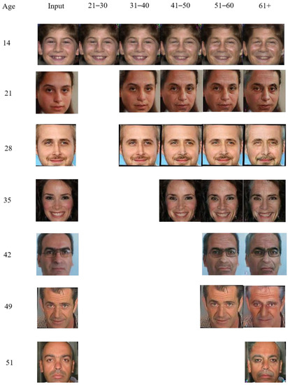 - Zhang, Z.; Song, Y.; Qi, H. Age progression/regression by conditional adversarial autoencoder. In Proceedings of the IEEE Conference on Computer Vision and Pattern Recognition, Honolulu, HI, USA, 21–26 July 2017; pp. 5810–5818. [Google Scholar]