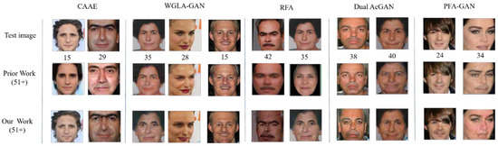 To illustrate the efficiency of the proposed GFAM, comparisons were performed with some of the latest state-of-the-art methods. As depicted in Figure 5, the proposed method demonstrated superior performance in producing aging effects on faces while maintaining identity information compared to the CAAE [1] method. Moreover, it outperformed the GAN-based WGLA-GAN [16] method in generating realistic aging details such as wrinkles and color distortion. Our approach also excelled over the RNN-based RFA [12] method in conserving the original identity information and preserving aging details. In terms of preserving details such as face shape and original skin tone, our method surpassed the cGAN-based approach of dual AcGAN [5]. Although PFA-GAN [7] performed better than our model in reducing ghosting, it is worth noting that our model preserves gender-specific information for women, such as the absence of beard growth.
