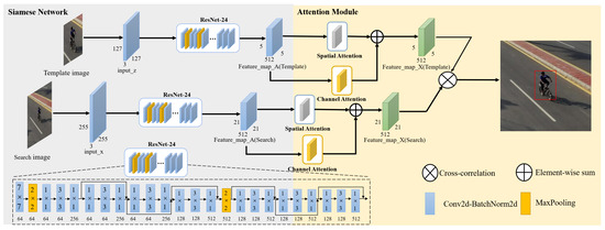 To address this problem, this study proposes an attention module in the system to further mine deep features. As shown in Figure 1, the features extracted by ResNet-24 are input into a spatial-channel attention module that aggregates features from different locations and channels of the target by giving higher weights to the region of interest. As shown in Figure 2, this attention module helps the system to suppress feature redundancy in the spatial and channel dimensions and better categorize the features of the target and background.