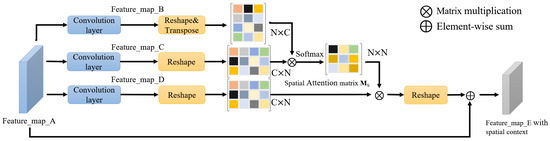 where is the C-dimensional row vector in , is the C-dimensional column vector in , is a scalar that denotes the influence of the position on the position and plays the role of spatial attention. The more similar the feature representations of two locations are, the stronger is the correlation between them.