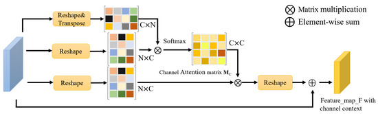 The architecture of the channel attention module is shown in Figure 5. Its process resembles the spatial attention feature extraction process. The convolution part is removed to ensure that the relationship between channels does not change. By reshaping into and multiplying it with its transpose, the channel attention matrix is calculated by the Softmax layer. This matrix is multiplied by the matrix, and the result is reshaped to , which represents the local feature of the channel attention. Finally, the same weighting method as the spatial attention is used to combine the local features of the channel attention and , obtaining the final channel attention .