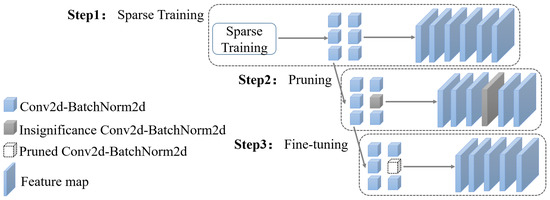 Step 1: Add the norm of the constraint BN layer coefficient to the loss function in the training process to promote the sparseness of . (This is done because the norm can make the constraint item approach zero while solving for the minimum value to sparse the parameters.) The loss equation [32] is