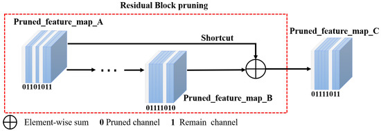 Residual block pruning strategy. “0” represents the pruned feature map, and “1” the retained feature map.