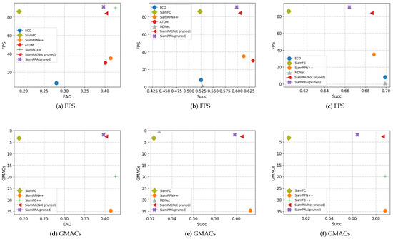 The objective indicators of the datasets VOT, UAV123 and OTB100 were used to evaluate the performance of the algorithm. Acc. in the VOT denotes the tracking accuracy calculated by the overlap rate between the predicted box and the ground truth box; Rob. denotes the stability of the tracking calculated by the number of tracking failures in the video; Expected Average Overlap (EAO) denotes the tracking expected average coverage rate calculated by Acc. and Rob., and is negatively correlated with the tracking failure time. An efficient algorithm generally has a low Rob. value and high EAO. and Acc. values. Prec. in UAV123 and OTB100 denotes the tracking accuracy calculated by the distance between the center of the predicted box and the center of the ground-truth box below the threshold (set as 20); Succ. denotes the success rate of the tracking calculated by IoU above the threshold (set as 0.6). FPS denotes the tracking speed calculated by the amount of tracking completed per second; MACs denotes the memory usage which is calculated per second; Params and model size denote the number of parameters and the size of the model, respectively.