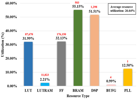 In this study, the pre-processing, feature extraction, and post-processing of SiamPRA were tested separately in the embedded system. Among them, pre-processing mainly included the data loading and scaling modules, feature extraction included the backbone network and attention mechanism modules, and post-processing corresponded to the tracking result return and target localization modules. As can be seen in Table 2, the embedded GPU-based algorithm implementation was the most time-consuming in this module owing to it being the most computation-intensive in feature extraction. However, in the ZCU102 platform, the feature extraction part was parallelized by the programmable logic (PL) side, and thus took only 0.02 s. As shown in Figure 10, the SiamPRA algorithm consumed only approximately 26.64% of the total PL hardware resources on average. For the other two modules, ZCU102 used the programmable system (PS) side for data scheduling and processing; thus, it requires a longer time and has a high potential for speedup. In the above experiments, the Xavier AGX had the fastest average inference time of 0.057 s, achieving real-time processing speed without engineering optimization. The above experimental results and analysis demonstrate the effectiveness of SiamPRA in vision tracking tasks.