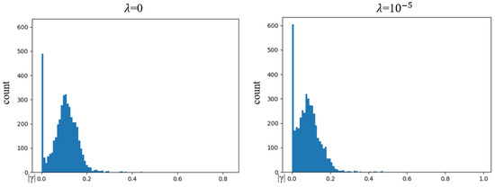 The first term denotes the logistic loss function in Algorithm 1 and is used to ensure that the difference between the estimated value of the convolutional network reference function and the ground truth is sufficiently small. The second item denotes the regular item that has the effect of sparse parameters and is the regularization constraint coefficient. In this paper, sparsification training is achieved by constraining ; thus, most of is zero or approximately zero to achieve sparsity. This ensures that all the convolution kernels with minimal effects are pruned in subsequent pruning. There is low loss of accuracy after pruning, thus accelerating the pruning process.