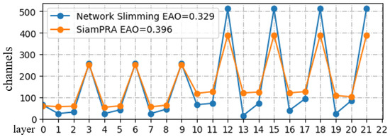 Current pruning algorithms such as [17,32] assume that networks containing Residual Blocks such as MobileNet and ResNet need the same number of channels in the first and last layers to perform elementwise addition. Usually, the last layer of the residual block is not pruned. Experimental results show that as the degree of pruning deepens, this type of algorithm will cause the number of channels in some layers to become very small, resulting in a significant decline in tracking performance. Because the number of channels in the last layer of the residual block is four times that of previous channels, it is difficult to sufficiently optimize the amount of computation. It can be seen from Figure 12 that the network pruned by the FP method at a similar pruning ratio is smoother, without some channels being close to zero, and has a higher EAO.
