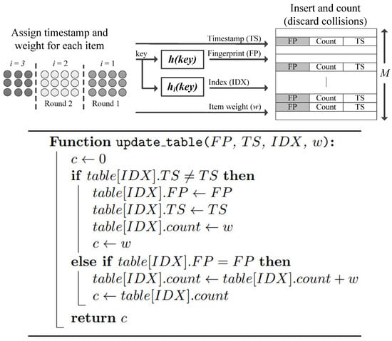 Sketch-based algorithms aim to summarize the frequency distribution of the data stream using a unique data structure referred to as a “sketch”. The frequency estimation sketch can be queried to output the estimated count of a particular item key. A very popular frequency estimation sketch is the count–min sketch []. The count–min sketch consists of several hash tables with different hash functions. The hash tables only contain count values in their entries. When the sketch is updated with a new item hit from the stream, the item key is hashed into all of the tables, and the relevant table entries are incremented. Since the hash functions are different, item collisions will differ in all of the tables. For any queried item, the table entry with the minimum count (minimum number of collisions) represents the best count estimate for the item.