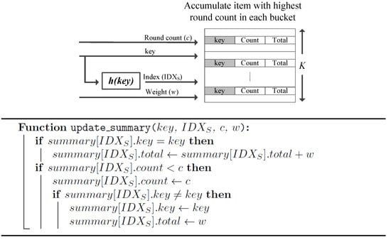 Each bucket in the summary contains three fields: an item key, round count, and total accumulate count for the item. The update_summary() function arguments are the key for the current item hit, the bucket index (IDXs) generated by the hash function, the item’s round count returned by the update_table() function, and the weight of the item. The procedure for updating the summary can be summarized as follows: