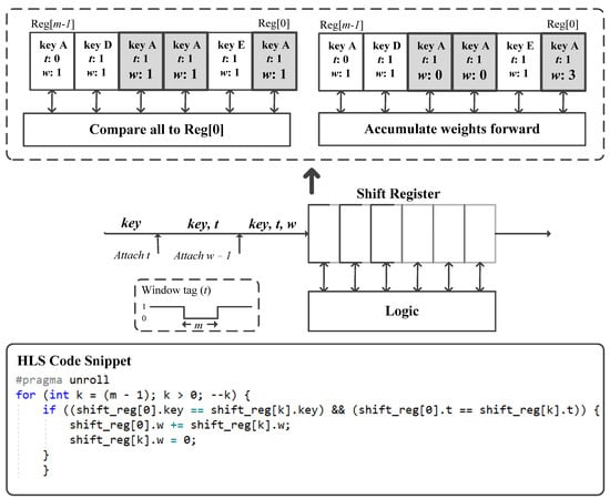 Implementing forward weight accumulation is straightforward with HLS as it only requires a simple loop unroll pragma (see the HLS code snippet in Figure 5). It should be noted that a previously proposed solution deployed a similar backward weight accumulation technique that does not require the stream to be divided into windows with alternating tags []. The idea was to keep accumulating wights backward in Reg[m − 1] to insert as many bubbles as possible into the pipeline. While the solution is perfect for simple frequency estimation sketches, it is not suitable for the algorithm presented in this paper. This is mainly because, in skewed data streams, the weights of frequent items will likely keep accumulating in the shift register for long intervals in the case of using a backward accumulation technique. This is highly undesirable for our sampling algorithm because updates of frequent items are delayed in the shift register and may fail to stick in any of the round table buckets when they eventually exit the shift register.