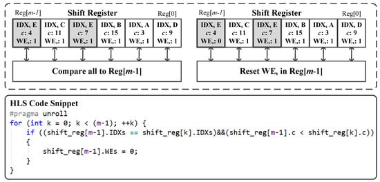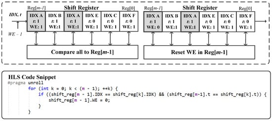 To resolve this data hazard, the table indexes are first pre-processed by an LSQ similar to the one used for forward weight accumulation. The LSQ consists of a shift register of size m and some data hazard detection logic (see Figure 6). When passing the indexes to the shift register, the kernel wraps a Write Enable (WE) variable as well as the same window tag t used in forward weight accumulation. The data hazard detection logic compares the index in Reg[m − 1] to all the indexes in the other registers. If any identical index that belongs to the same window is detected, the WE variable in Reg[m − 1] is reset. In later stages in the pipeline, any key update with WE = 0 is discarded.