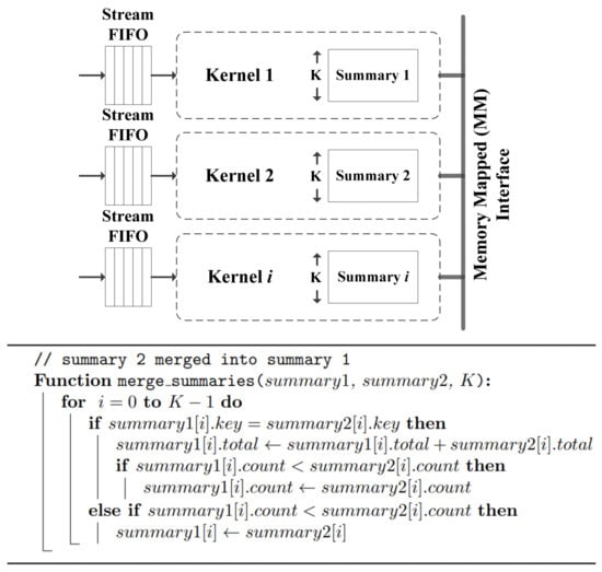 One of the important advantages of the algorithm proposed in this paper is the ease of vectorizing the algorithm in hardware. First, the data stream is naturally divided into rounds that can be processed independently by several kernel replicas (see Figure 8). Second, the host only needs to access the smaller heavy hitter summary data structure in each kernel, which is implemented as a slave memory. Third, the merging of heavy hitter summaries is very simple, especially if the same hash function is used for all the summaries. The pseudo code in Figure 8 shows how two summaries from two kernel replicas can be merged when the same hash function and the same round sizes are used in the different kernel replicas. The merge process can be performed efficiently by the host as it only has a time complexity of O(n), where (). In addition, if the heavy hitter summary configuration is changed in the HLS code to grant both read and write access to the host, the merge process can be performed in-place without the need to copy the summaries to the host’s memory.
