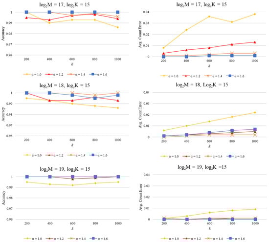 Figure 9 reports the accuracy and average error for synthetic data streams. The datasets were generated as Zipfian distributions []. The size of all datasets was fixed to 107 items, and the Zipfian parameter (α) was varied from 1.0 to 1.6 in intervals of 0.2. The range of α was selected to cover typical values of data skew in several types of real data streams []. There are several factors that would influence the best choice of round size r []. For simplicity, r was fixed to M in all simulation runs (M—size of the round table in the kernel).