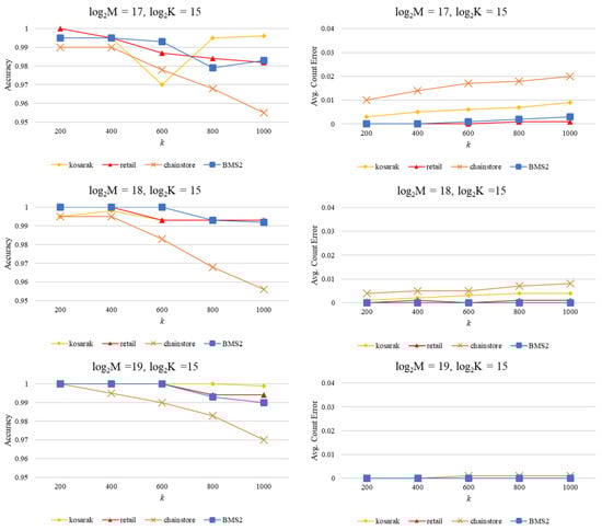 To further verify the kernel’s performance, four different real datasets were also used for accuracy analysis. The properties of the datasets are summarized in Table 3. All of these datasets are easily available and widely used in the analysis of itemset mining algorithms. Retail contains market basket transactions data from an anonymous Belgian retail store []. Kosarak is a collection of click-stream data from a Hungarian online news portal []. Chainstore contains customer transactions from a major grocery store in California, USA []. Finally, BMS2 contains click-stream data from an anonymous webstore []. All of these datasets were originally structured as transactional datasets consisting of several separated transactions, each containing a number of integer items. For the purpose of stream item counting, these datasets were pre-processed to merge the transactions into a serial stream of items. Figure 10 reports the accuracy and average error count results when processing these real data streams.