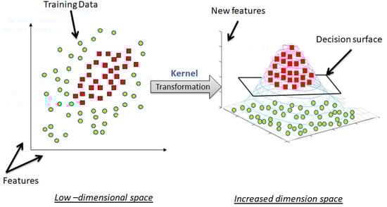 The SVM algorithm can be implemented in two ways: using a kernel or using a quantum processor (QSVM). In cases where the data set is non-linear and cannot be handled by a linear classifier, the distance between each point and the center is calculated to create a new feature, which enables classification in a higher-dimensional space (see Figure 8).