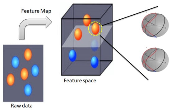 Quantum feature map: Feature classification using nonlinear kernel for the case of 2 classes (1st class: orange balls, 2nd class: blue balls).