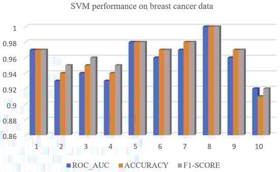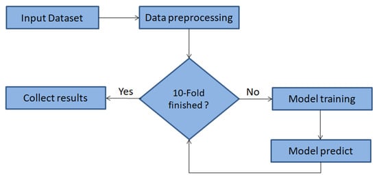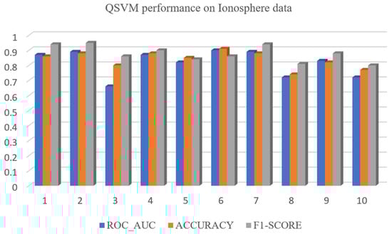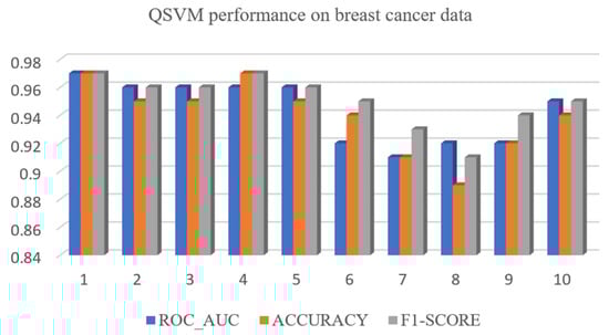 To provide a more technical review, we conducted an experimental study to compare the performance of QSVM and classical SVM on three datasets, two of which were used for the first time in this study. The experiments were conducted in several phases, including data preprocessing, quantum and classical model training, and prediction using a 10-fold cross-validation approach. Cross-validation is the sampling by no overlap test sets, while “fold” is the number of resulting subsets by randomly sampling cases from the learning set without replacement. Then, the model is applied to the remaining subset, denoted as the validation set, and the performance is measured. This procedure is repeated until each of the k subsets has served as the validation set. In the 10-fold cross-validation, the first fold serves as the validation set, and the remaining nine folds serve as the training set. In the second fold, the second subset is the validation set, the remaining subsets are the training set, and so on. The cross-validated accuracy, for example, is the average of all ten accuracies achieved on the validation sets [85,86]. Figure 10 shows a diagram of the experimental setup: