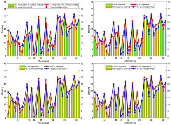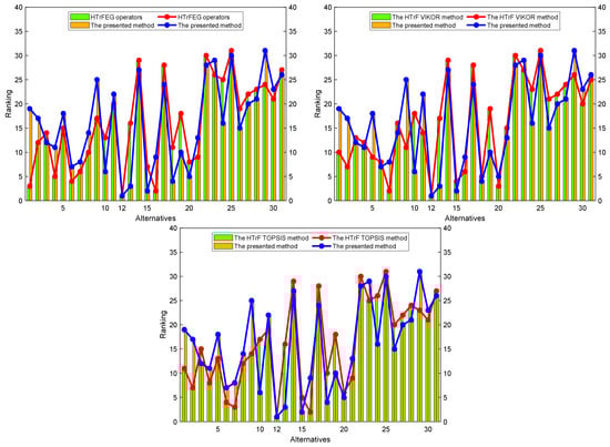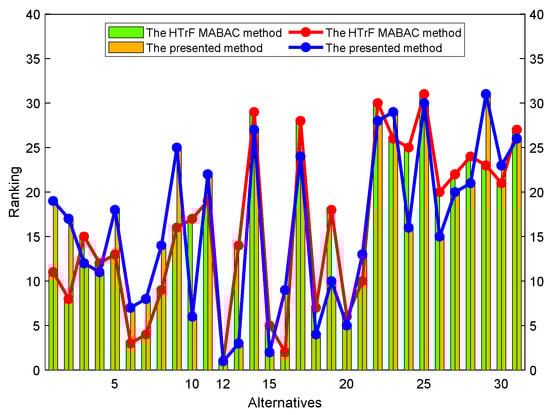 The experimental results outlined above demonstrate that the decision-making method based on HTrF MGRSs on two-universe represents a comprehensive utilization of the strengths of HTrFSs and MGRSs. First, HTrFSs offer significant advantages over other fuzzy sets by allowing for a more precise representation of fuzzy or imprecise information through TrFNs. Moreover, HTrFSs combine the advantages of HFSs to enable decision-makers to express their hesitations or uncertainties during the decision-making process, thus enabling them to consider all possible scenarios and make more informed decisions. Then, the MGRSs on two-universe approach serves as an excellent information fusion strategy that integrates the perspectives of different experts to arrive at a final conclusion. Furthermore, we leverage DMISs to mitigate the impact of disagreements among the experts within the expert group on the evaluation outcomes. By incorporating DMISs, the presented MAGDM method offers a multifaceted evaluation scheme to experts, allowing them to attain more sensible and precise evaluation results. In summary, the MAGDM method presented in this article substantially reduces the uncertainty involved in decision-making and enhances its accuracy and reliability. By combining the advantages of HTrFSs, MGRSs, and DMISs, the proposed approach provides a viable option for assessment and decision-making in situations of uncertainty and fuzziness. The proposed approach demonstrates the potential for solving decision problems in various domains.
