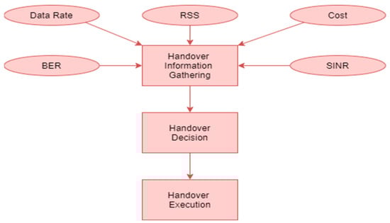 The handover process consists of three stages, as shown in Figure 1. The handover initiation stage detects networks and the main attributes of the network via the Media Independent Handover Function (MIHF) [3,4]. The handover decision making chooses the best network based on network information and initiates the handover at the appropriate time. Handover execution establishes the connection with the selected network and releases the old network. Several handover criteria can be used to perform a handover decision, such as received signal strength (RSS), data rate, monetary cost, bit error rate (BER), and signal-to-interference plus noise ratio (SINR). Using multiple criteria in performing handover decisions can provide a better handover performance than conventional handover algorithms that depend on one or two handover parameters.
