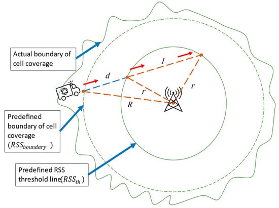 The proposed handover algorithm takes the mean value of RSS samples to minimize the oscillation of RSS signals. The RSS values, can be obtained using Equation (17) [22]. The formula for calculating the RSS mean value, , is given in Equation (18).