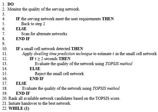 This paper proposes a handover scheme that combines the dwelling time prediction technique and TOPSIS. The proposed method is less complicated than the intelligent-based handover algorithm because it does not require data training and learning, such as in the case of Xiaonan et al. [7]. The pseudocode of the proposed handover decision-making algorithm is shown in Figure 3. The MT initiates the handover process if the RSS of the serving network falls below the threshold value where it does not meet the user’s service requirements.