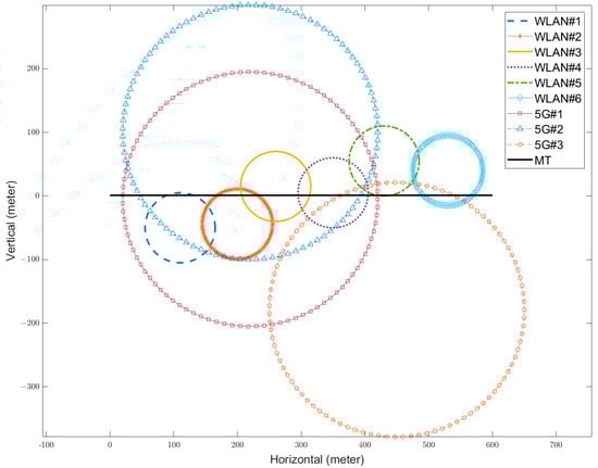 The proposed handover is simulated by 100 loops in the heterogeneous wireless network environment that consists of 4G LTE, 5G, and WLAN networks, as shown in Figure 4. The 4G LTE has the most comprehensive network coverage, covering all the 5G and WLAN networks. This assumes that the MT initially connects to the 4G LTE and moves from point A to destination B traverses the heterogeneous networks at high speed (40–100 km/h). The simulation parameters are tabulated in Table 2 [7,12].